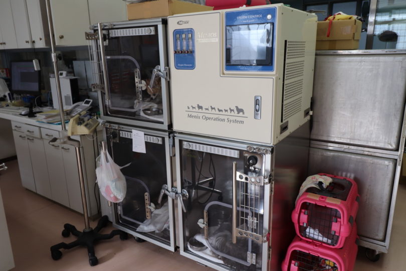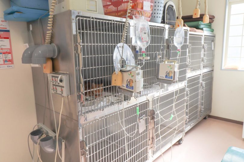 院内には動物用ケージが43設置してあり、たくさんのわんちゃん、ねこちゃんを受け入れることができます。入院室には冷暖房を完備し、術後の体温低下を防ぐケージ内床暖房設備、呼吸困難な動物のために呼吸を楽にする酸素室などがあります。